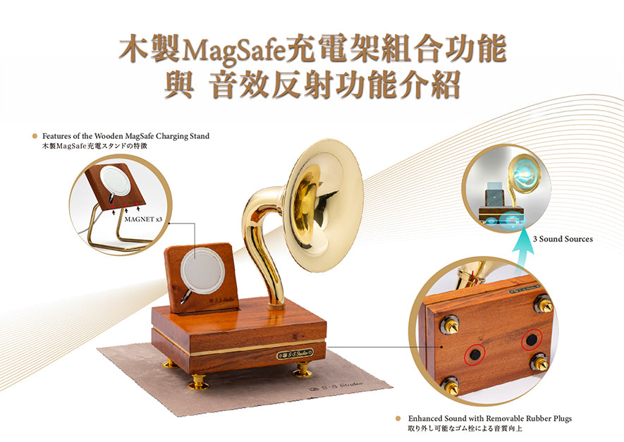 使用簡單的物理共鳴原理,擁有精緻設計細節。超合金魂追求卓越品質。發燒音響腳釘增強音響效果,橡膠塞移除後增強音樂立體感,實木充電支架與SS Studio 史丹工作室結合使用...